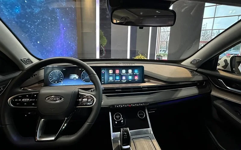 کابین ام وی ام X77 با مواد باکیفیت و طراحی ارگونومیک، تجربهای لوکس ارائه میدهد. داشبورد دو رنگ با نمایشگرهای دوگانه 12.3 اینچی، مرکز توجه است. صندلیهای چرمی با قابلیت تنظیم برقی و گرمکن، راحتی طولانیمدت را تضمین میکنند.