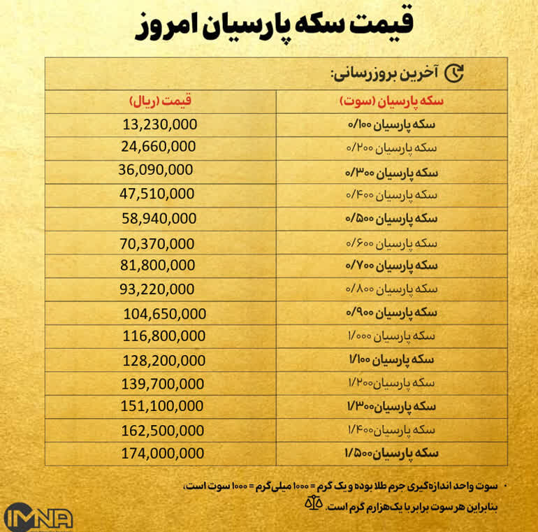 به گزارش خبرگزاری ایمنا، قیمت سکه پارسیان امروز _چهارشنبه پنجمآذر_ در انواع سوت با عیار ۷۵۰ را در جدول زیر مشاهده کنید.