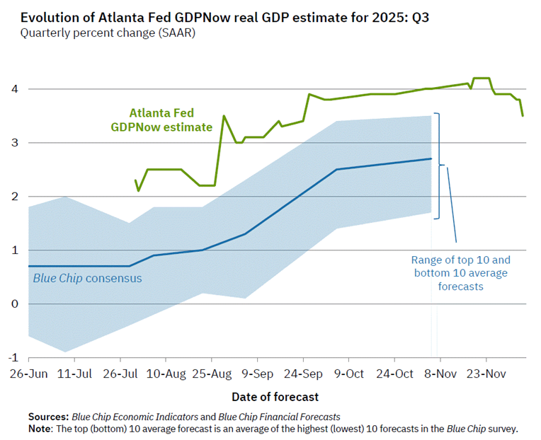 گزارش رسمی تولید ناخالص داخلی (GDP) سه‌ماهه سوم هنوز منتشر نشده است، زیرا اداره تحلیل اقتصادی (BEA) در حال بازیابی داده‌های خود پس از تعطیلی دولت است. بر اساس تخمین‌های فعلی، انتظار می‌رود رشد اقتصادی در Q3 به حدود ۳.۵ درصد رسیده باشد، که این رقم بر اساس داده‌های GDPNow فدرال رزرو آتلانتا (تا ۵ دسامبر) محاسبه شده است. این میزان تنها کمی کمتر از رشد۳.۸ درصدی Q2 است.