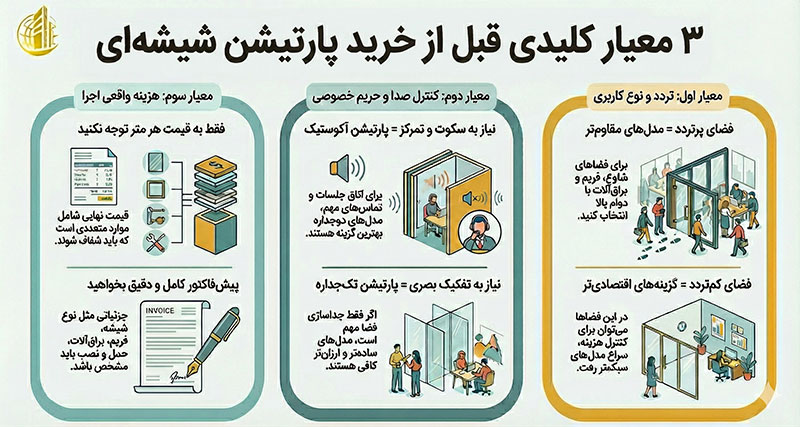 برای هومآفیس و دفترهای کوچک، یک سوال کلیدی وجود دارد: «آیا تماسهای کاری و جلسات مهم دارید یا فقط تفکیک بصری میخواهید؟» اگر تماس و جلسه جزء استفاده روزانه است، مدلهای آکوستیک (دوجداره) یا ترکیب شیشه مات/سندبلاست ارزش پیدا میکنند. اگر هدف اصلی فقط جداسازی فضا و نظمدهی است، تکجداره یا فریم سبک معمولاً کفایت میکند و اقتصادیتر تمام میشود.